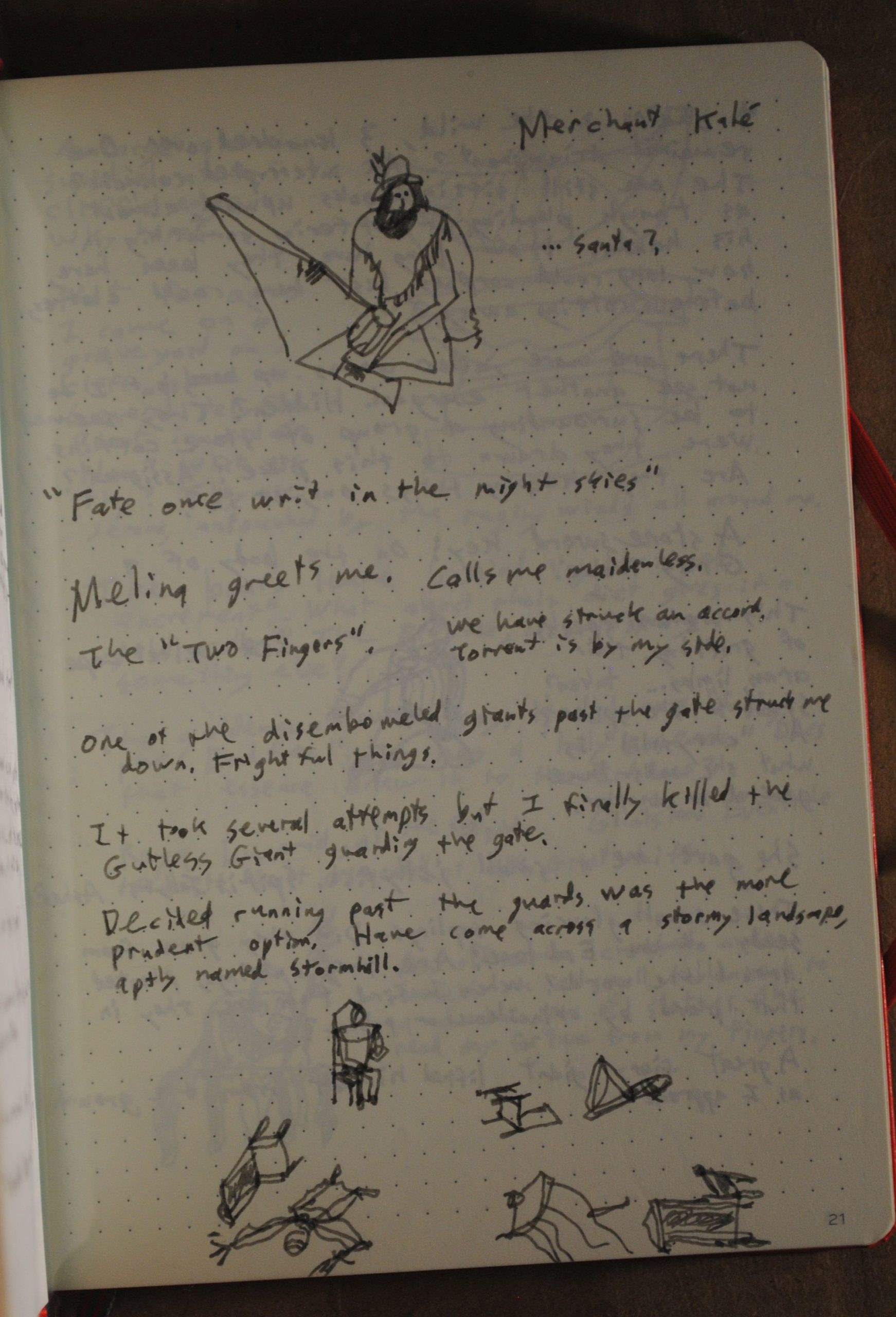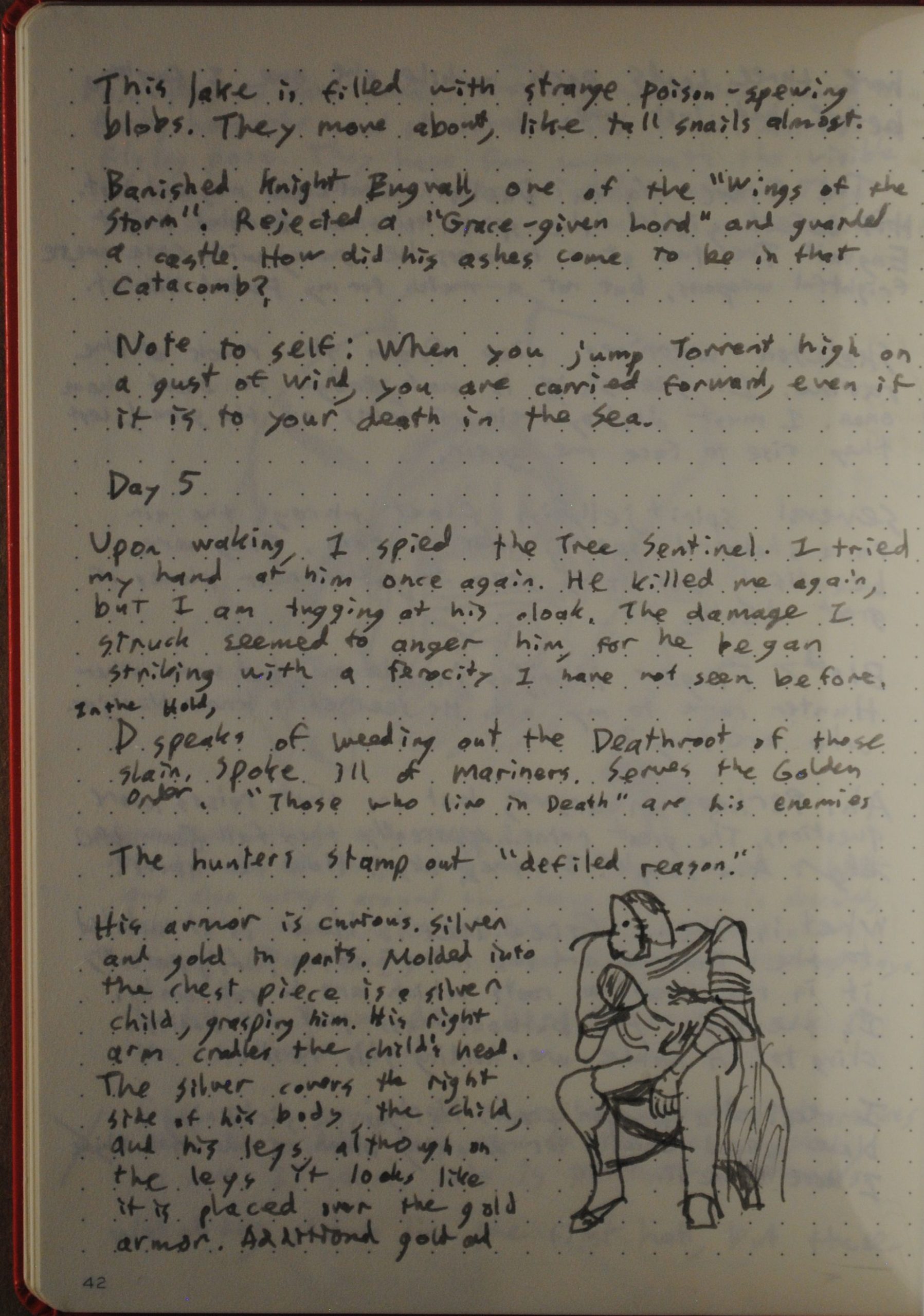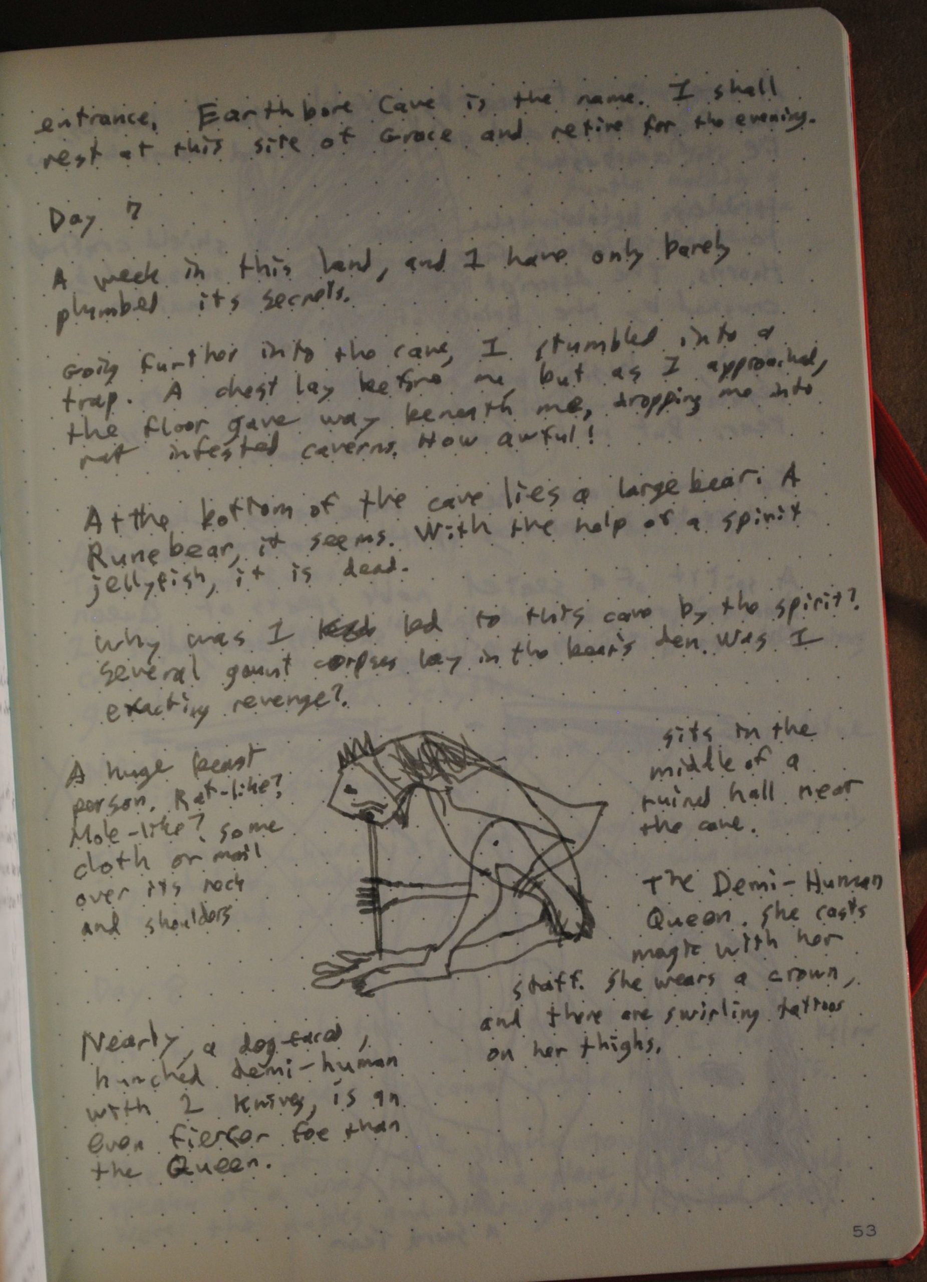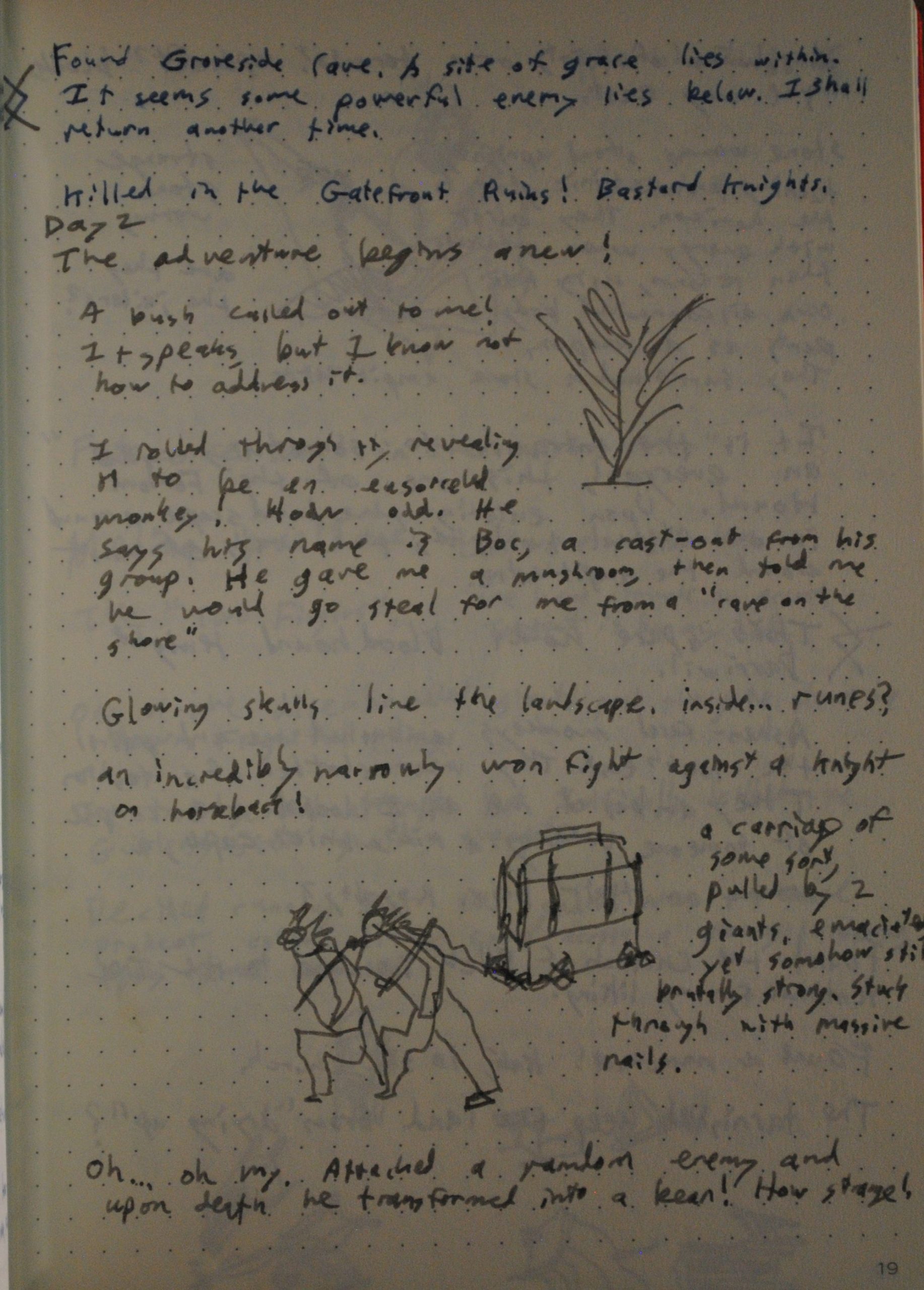 Also, I know the art’s bad. It gets a little bit better past the first day but it never gets good. I’m not doing this to show off my art skills or anything. This whole project is kind of a roleplaying exercise but also me wanting to experience and explore the lore of the game with absolutely fresh eyes. I’ve always thought that the lore and story of these games are meant to be interpreted anew by every player and that many parts of the game are deliberately ambiguous. So I’m putting my money where my mouth is and doing the exercise myself. I’m putting it all online because I have friends who would get a kick out of it. Anyway. Scans!