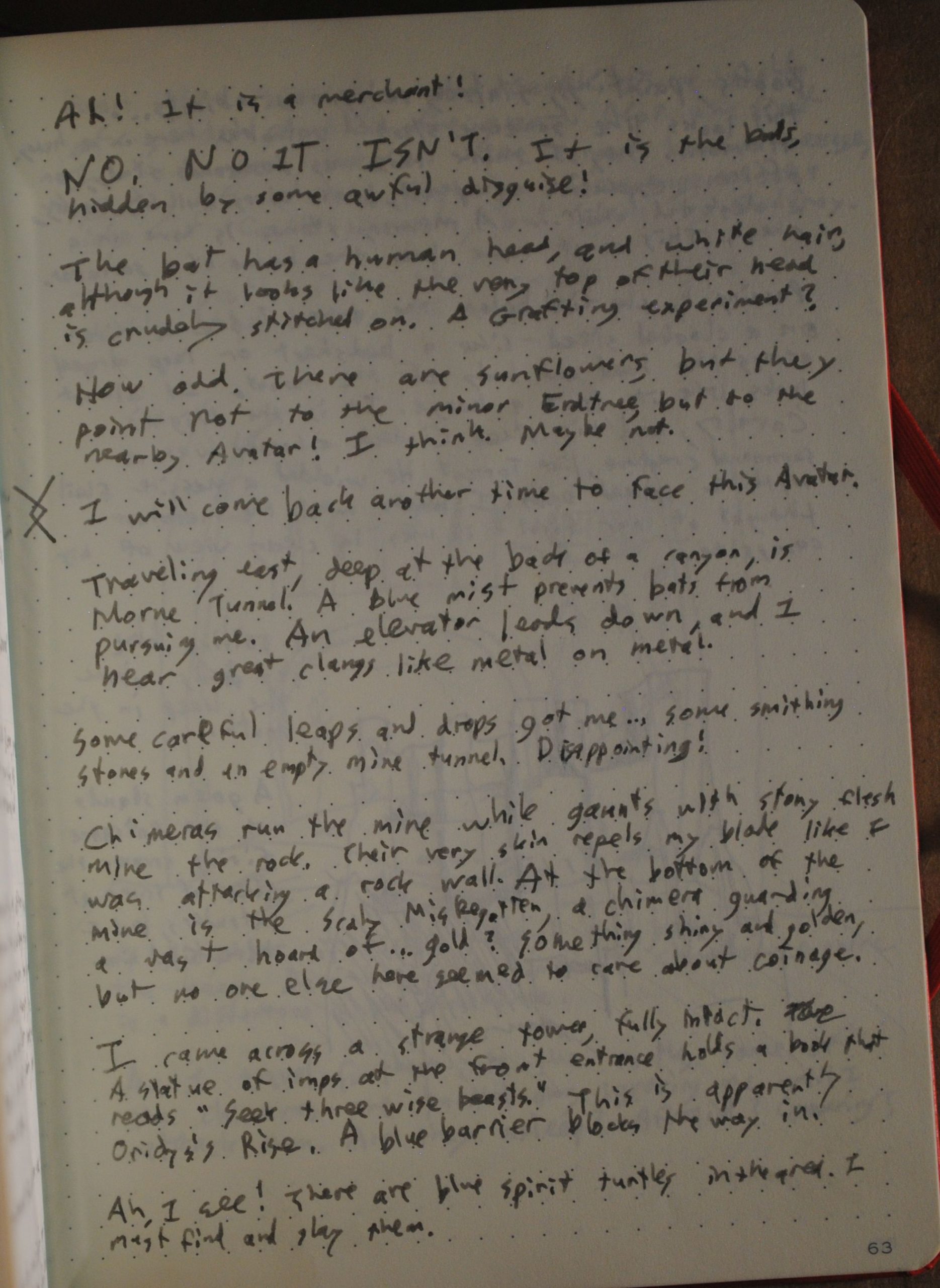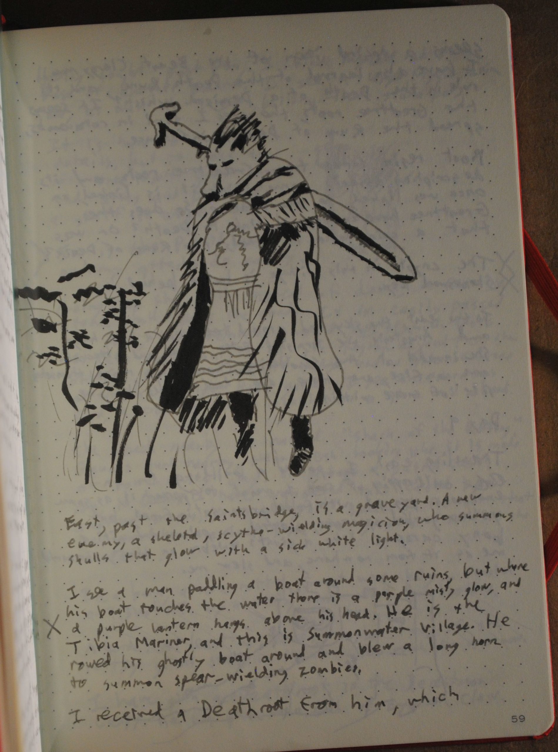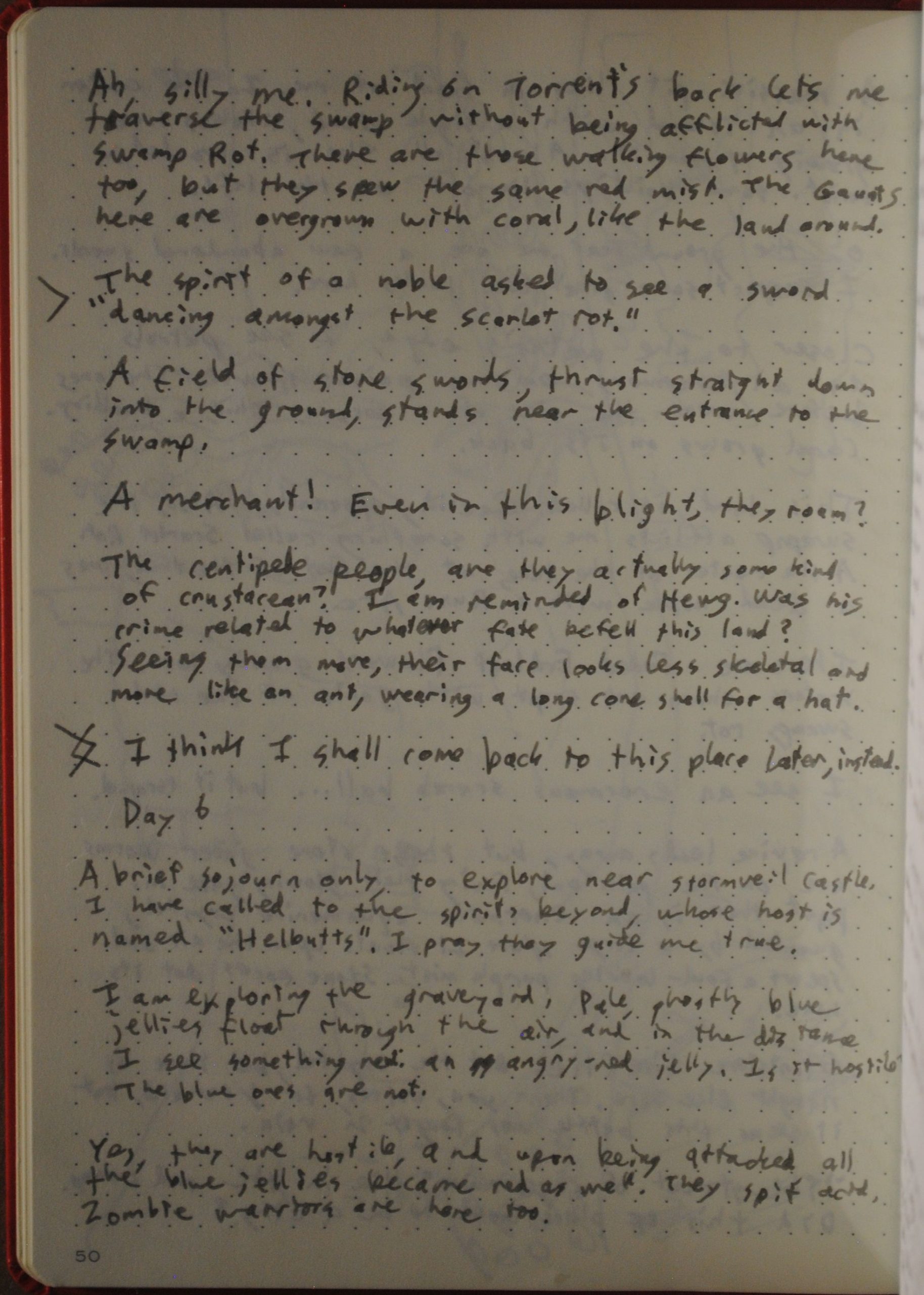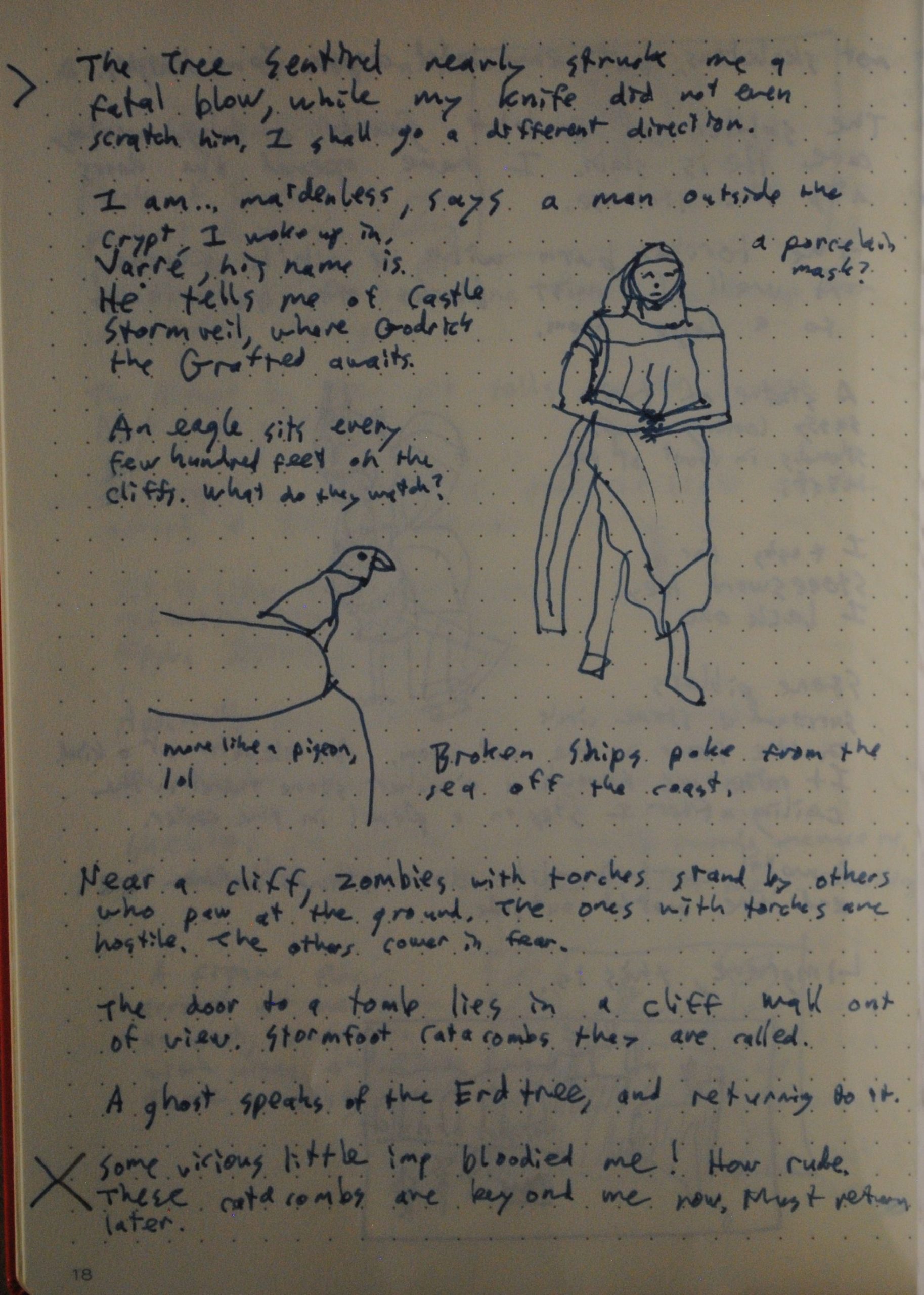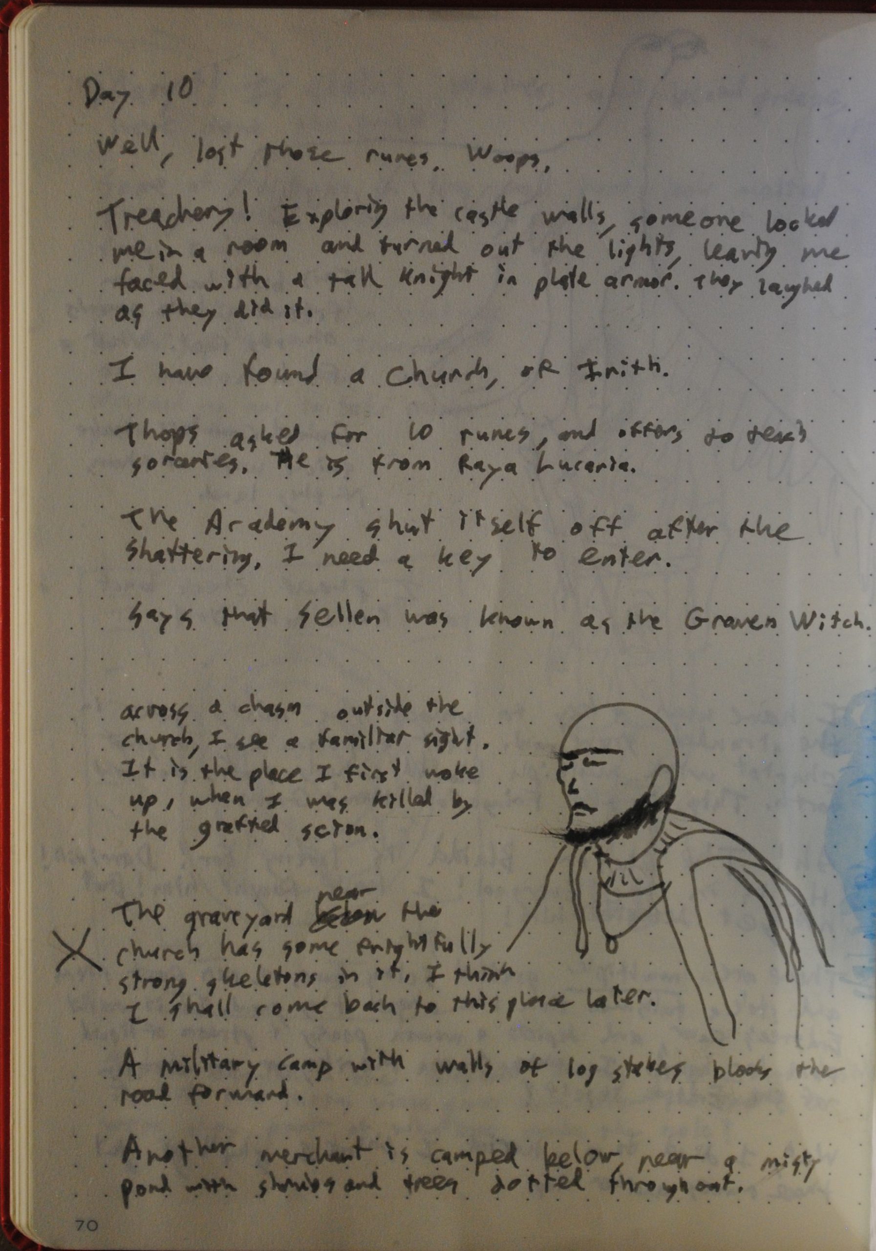 Also, I know the art’s bad. It gets a little bit better past the first day but it never gets good. I’m not doing this to show off my art skills or anything. This whole project is kind of a roleplaying exercise but also me wanting to experience and explore the lore of the game with absolutely fresh eyes. I’ve always thought that the lore and story of these games are meant to be interpreted anew by every player and that many parts of the game are deliberately ambiguous. So I’m putting my money where my mouth is and doing the exercise myself. I’m putting it all online because I have friends who would get a kick out of it. Anyway. Scans!