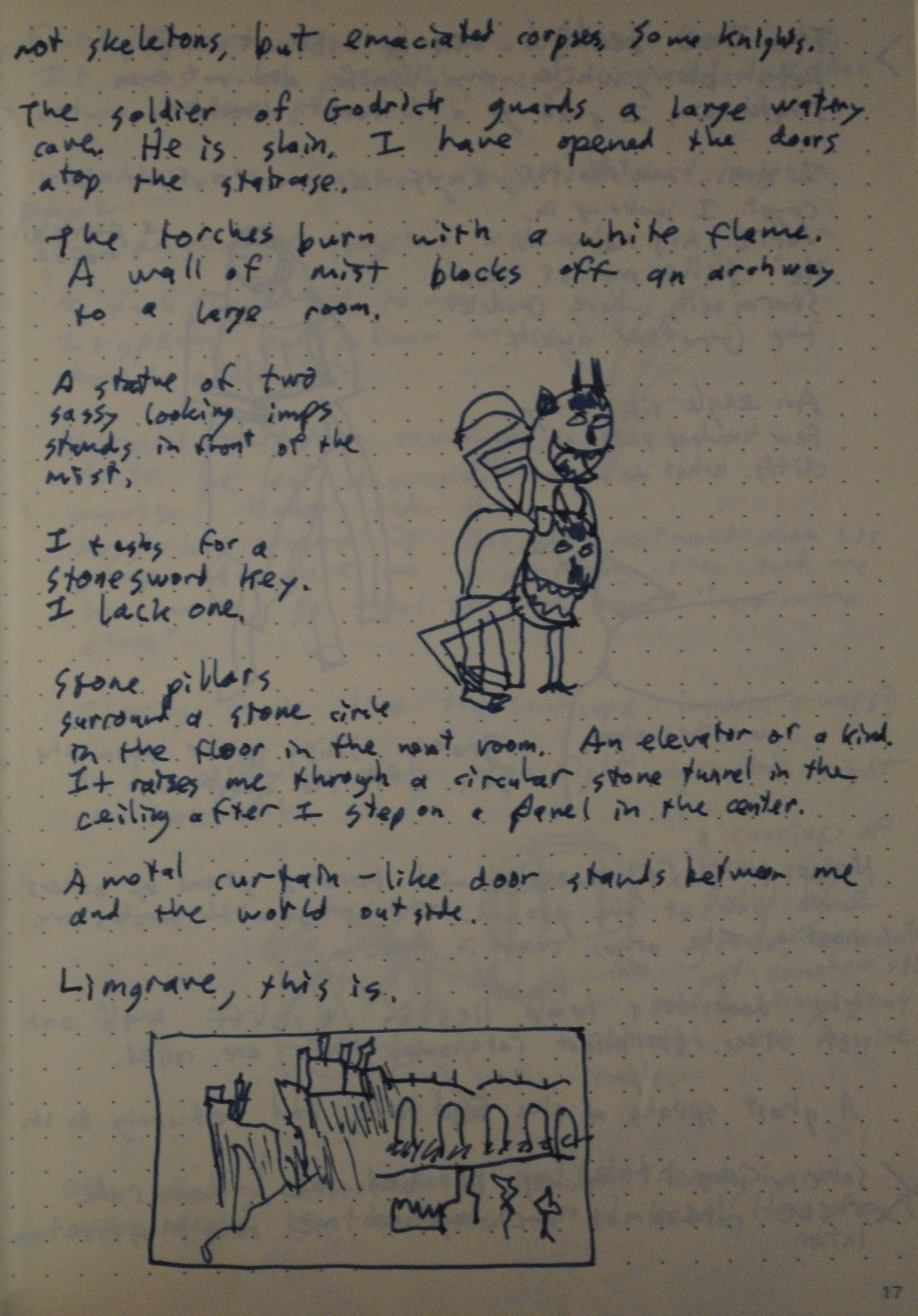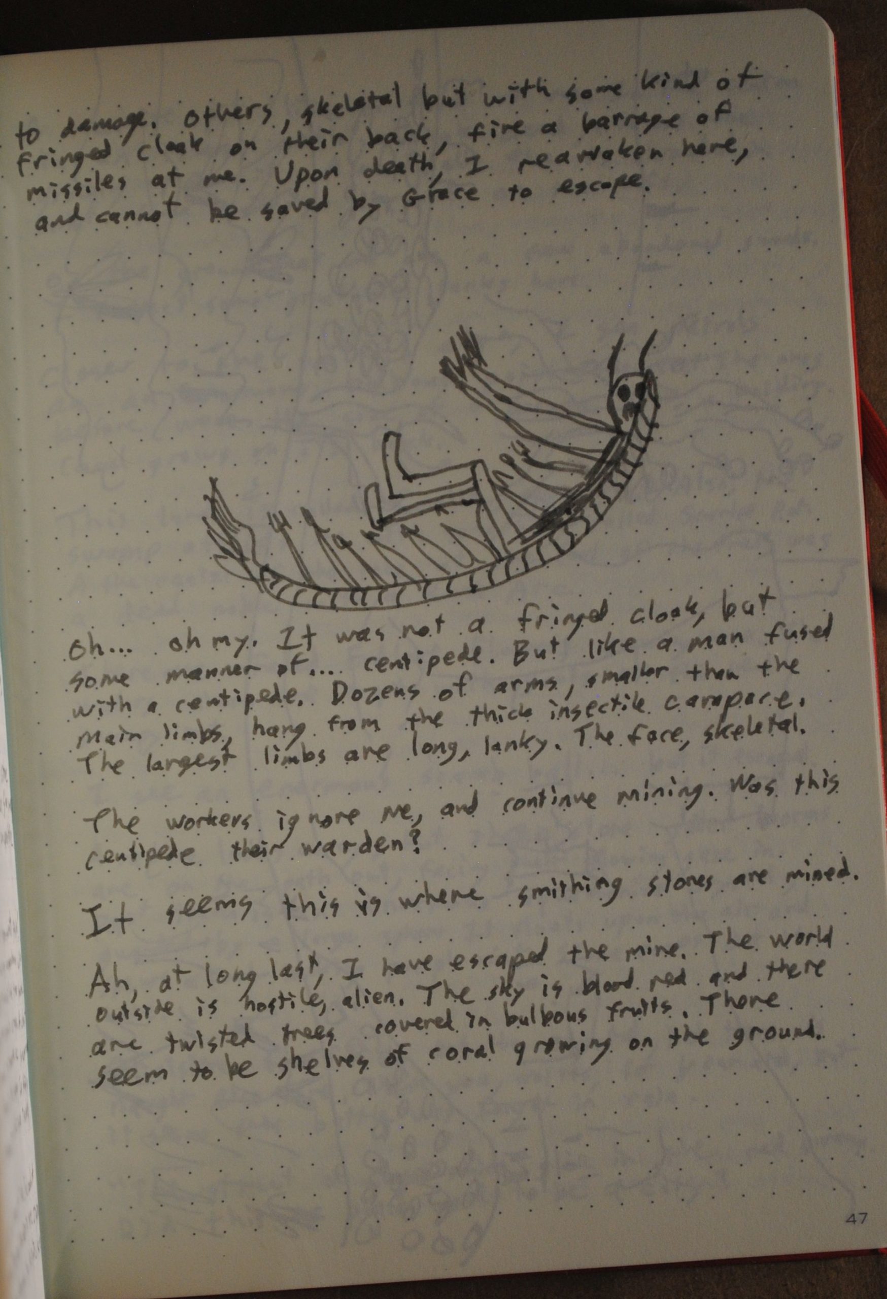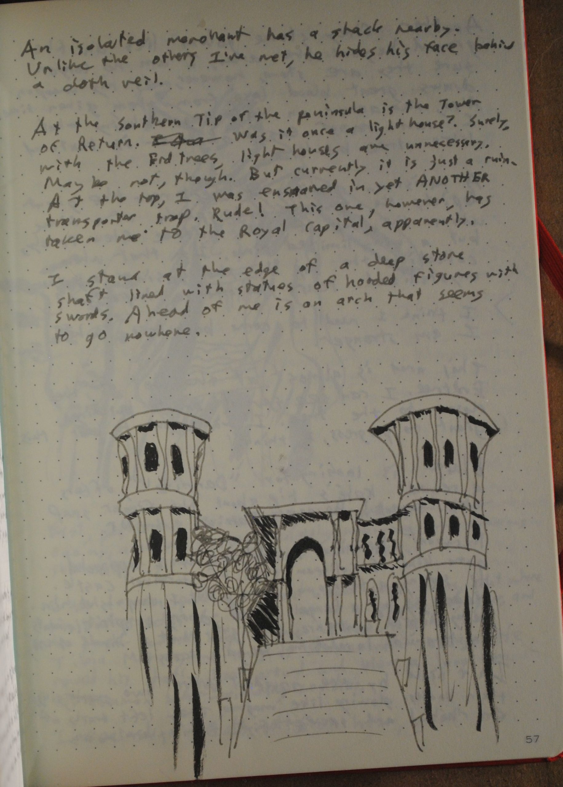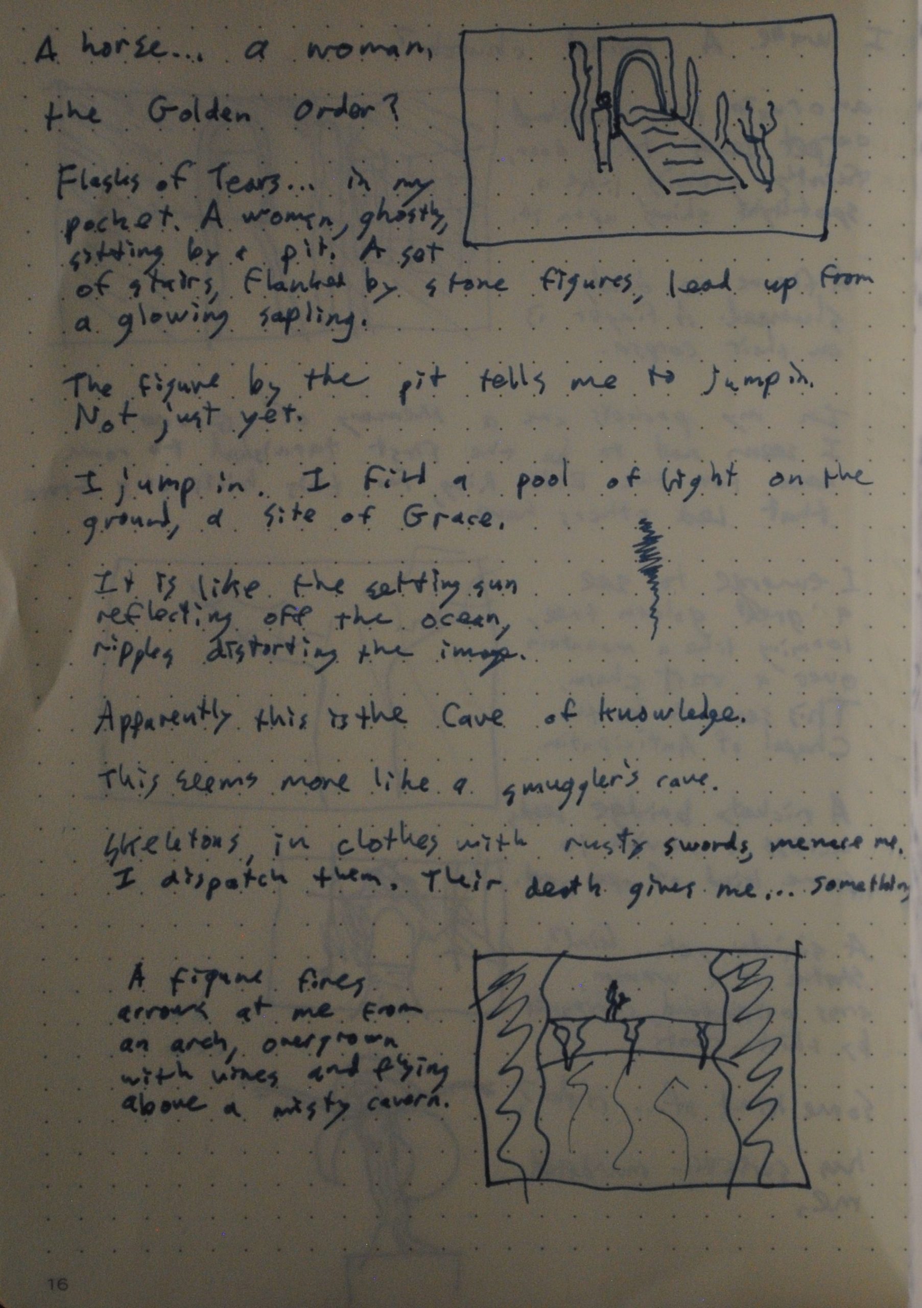 Also, I know the art’s bad. It gets a little bit better past the first day but it never gets good. I’m not doing this to show off my art skills or anything. This whole project is kind of a roleplaying exercise but also me wanting to experience and explore the lore of the game with absolutely fresh eyes. I’ve always thought that the lore and story of these games are meant to be interpreted anew by every player and that many parts of the game are deliberately ambiguous. So I’m putting my money where my mouth is and doing the exercise myself. I’m putting it all online because I have friends who would get a kick out of it. Anyway. Scans!