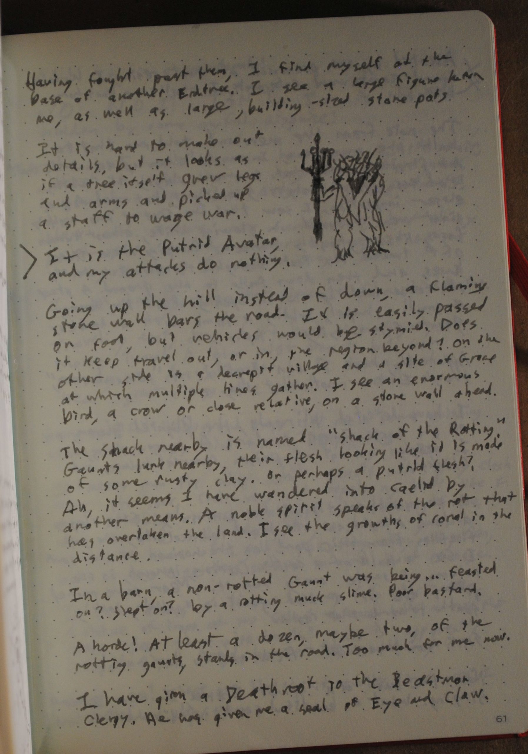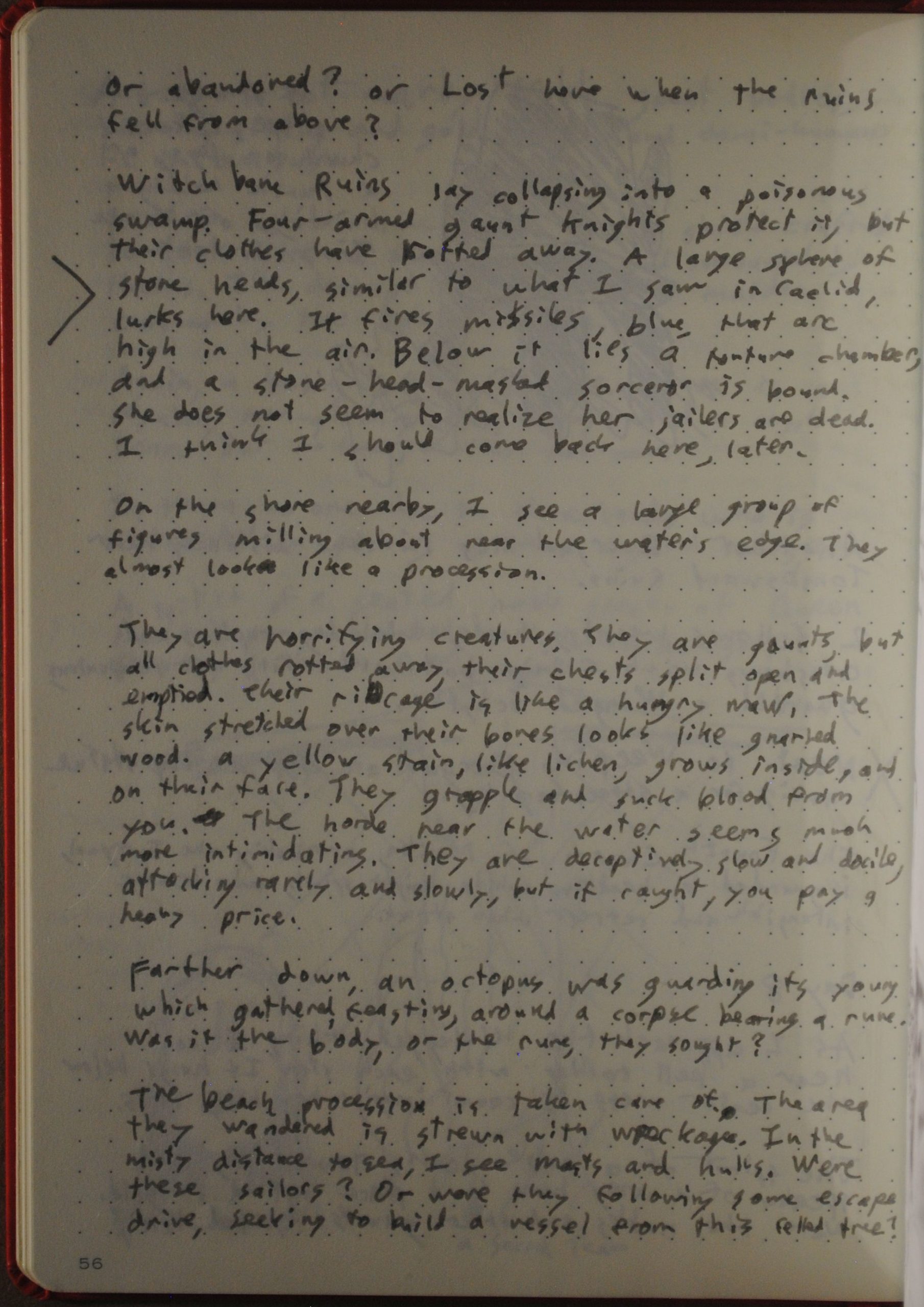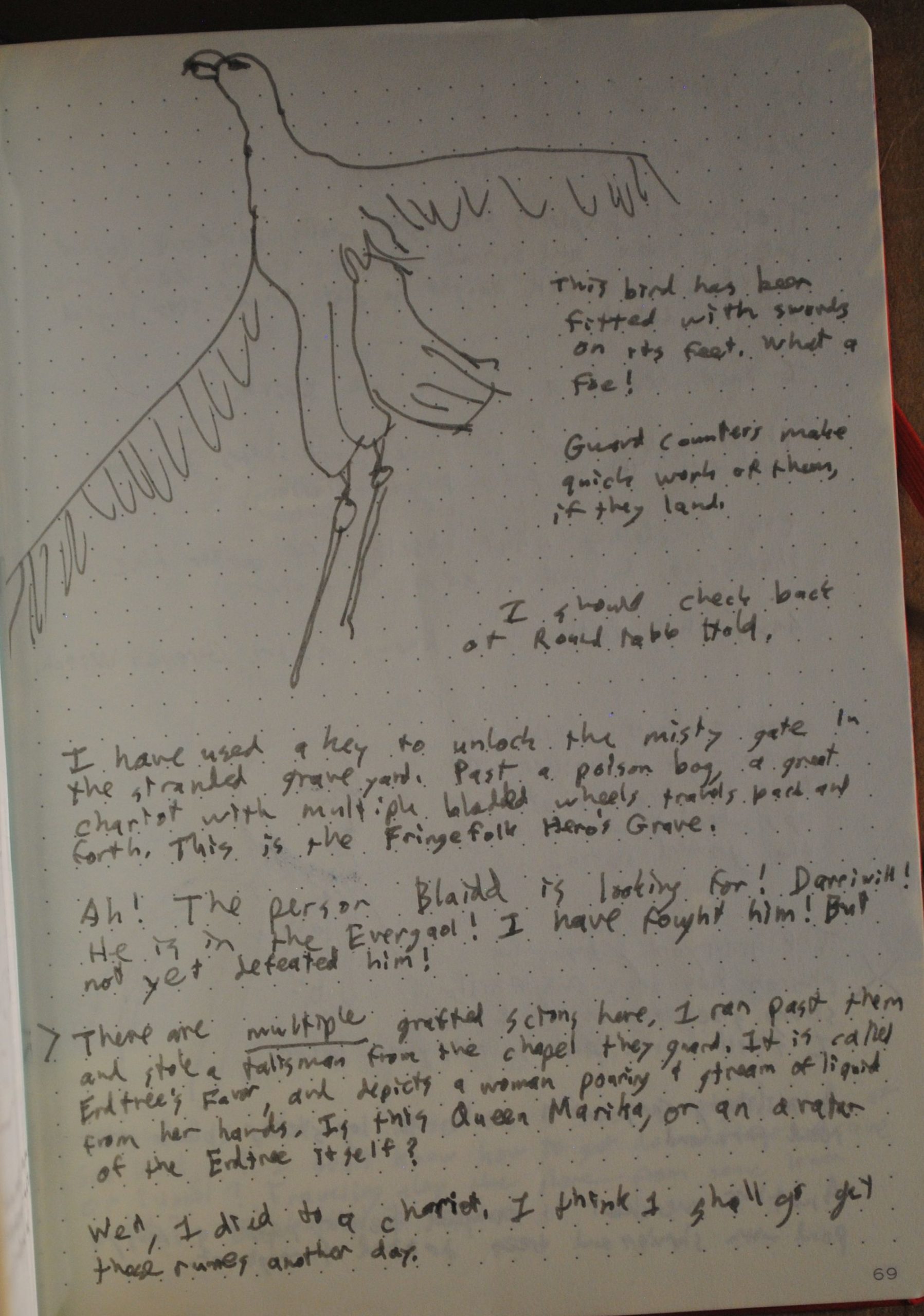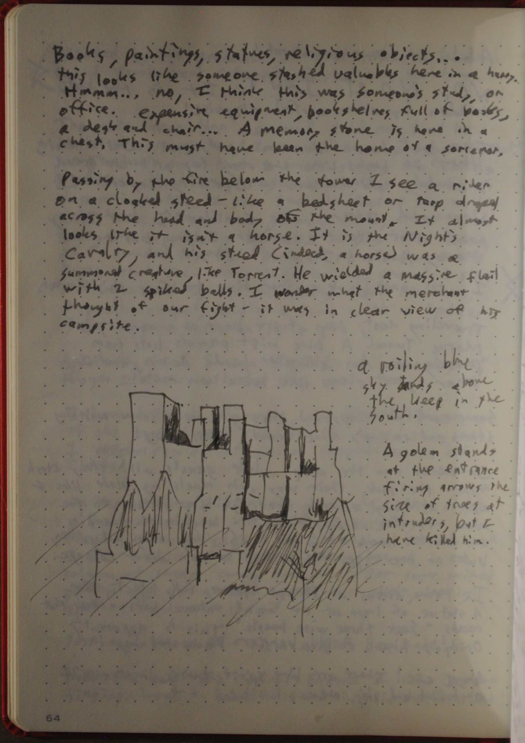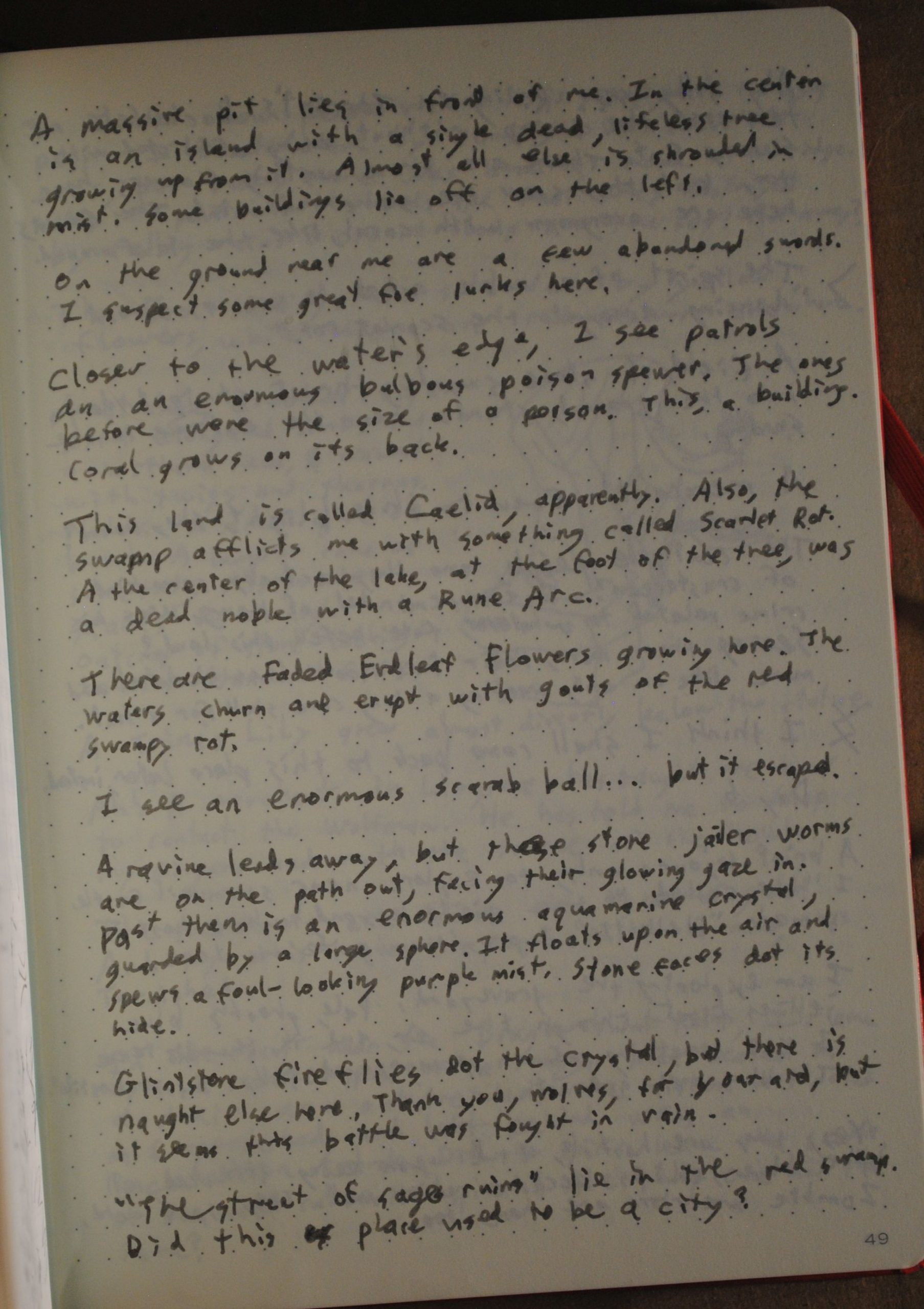Also, I know the art’s bad. It gets a little bit better past the first day but it never gets good. I’m not doing this to show off my art skills or anything. This whole project is kind of a roleplaying exercise but also me wanting to experience and explore the lore of the game with absolutely fresh eyes. I’ve always thought that the lore and story of these games are meant to be interpreted anew by every player and that many parts of the game are deliberately ambiguous. So I’m putting my money where my mouth is and doing the exercise myself. I’m putting it all online because I have friends who would get a kick out of it. Anyway. Scans!