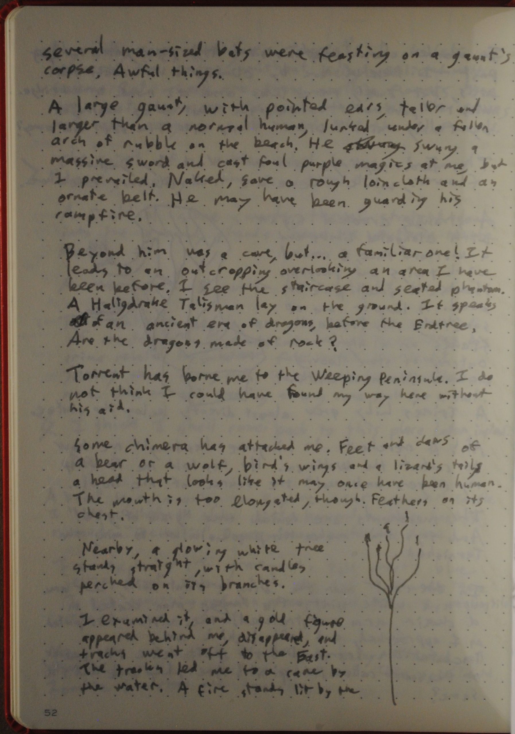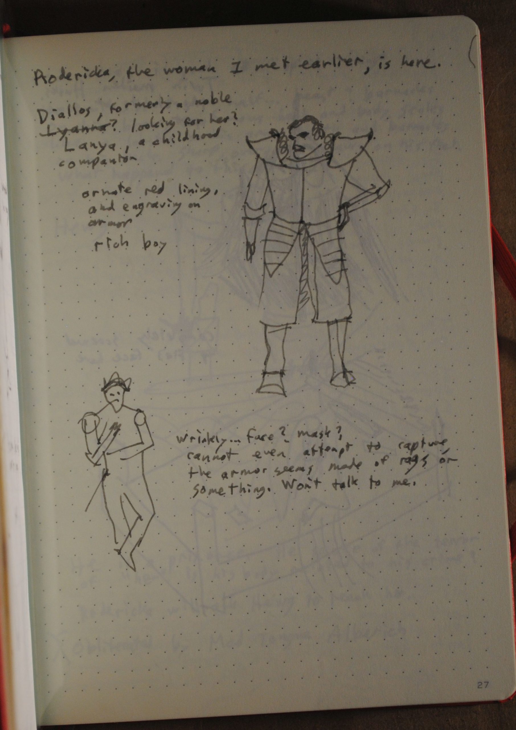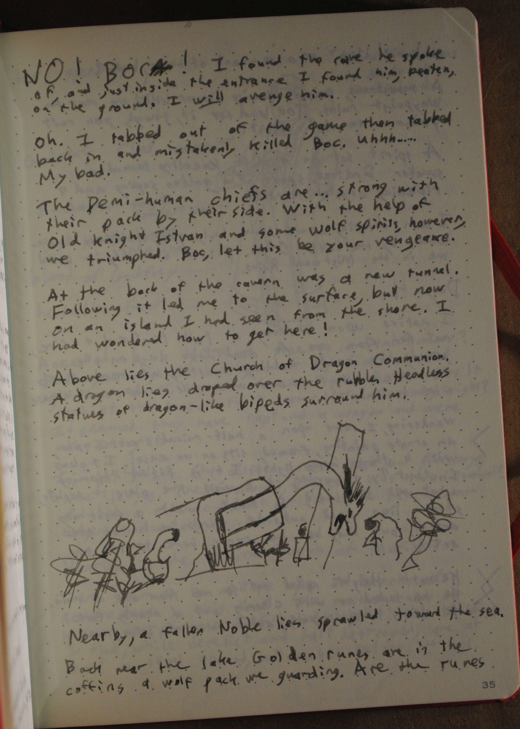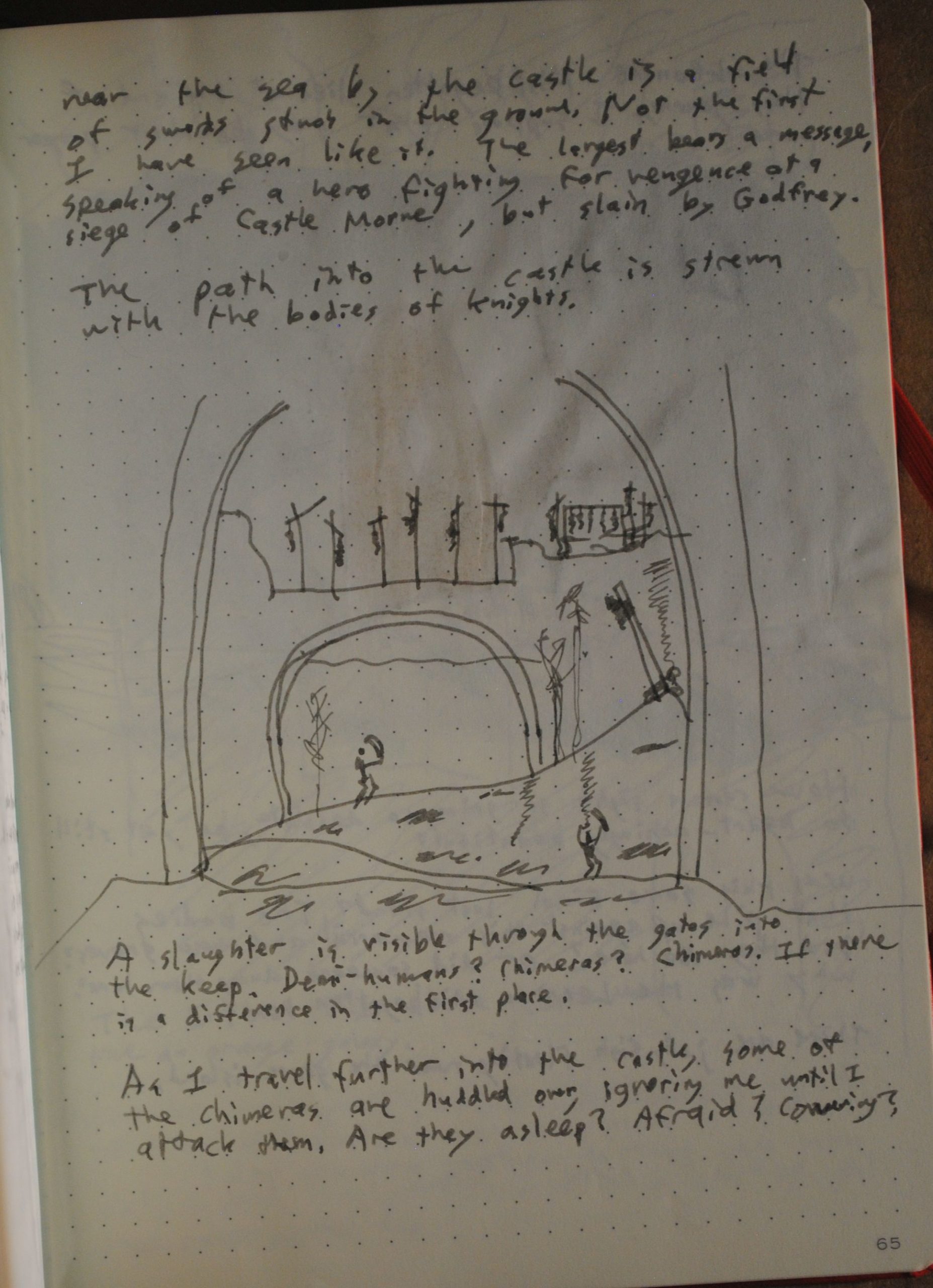 Also, I know the art’s bad. It gets a little bit better past the first day but it never gets good. I’m not doing this to show off my art skills or anything. This whole project is kind of a roleplaying exercise but also me wanting to experience and explore the lore of the game with absolutely fresh eyes. I’ve always thought that the lore and story of these games are meant to be interpreted anew by every player and that many parts of the game are deliberately ambiguous. So I’m putting my money where my mouth is and doing the exercise myself. I’m putting it all online because I have friends who would get a kick out of it. Anyway. Scans!